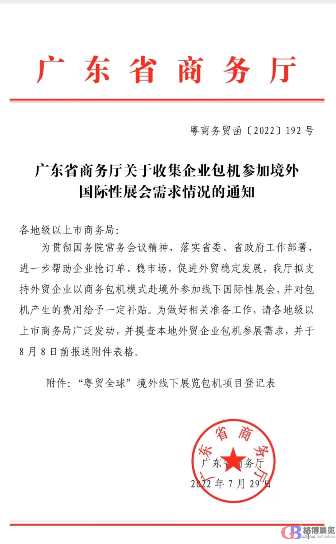《广东省商务厅关于收集企业包机参加境外国际性展会需求情况的通知》