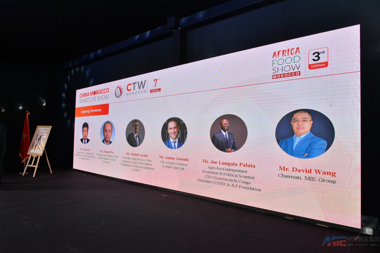 开幕仪式上,商务部对外贸易司副司长孟岳、中国驻摩洛哥使馆经商处参赞郑伟、摩洛哥企业联合总会(CGEM)中摩商业委员会主席迈赫迪・拉腊基、阿尔瓦解决方案与绿色开放实验室首席执行官阿明・扎鲁克、科内克& JLP基金会主席若・伦加拉・帕拉塔先生及MIE集团总裁王海林等中外重要嘉宾出席开幕仪式。